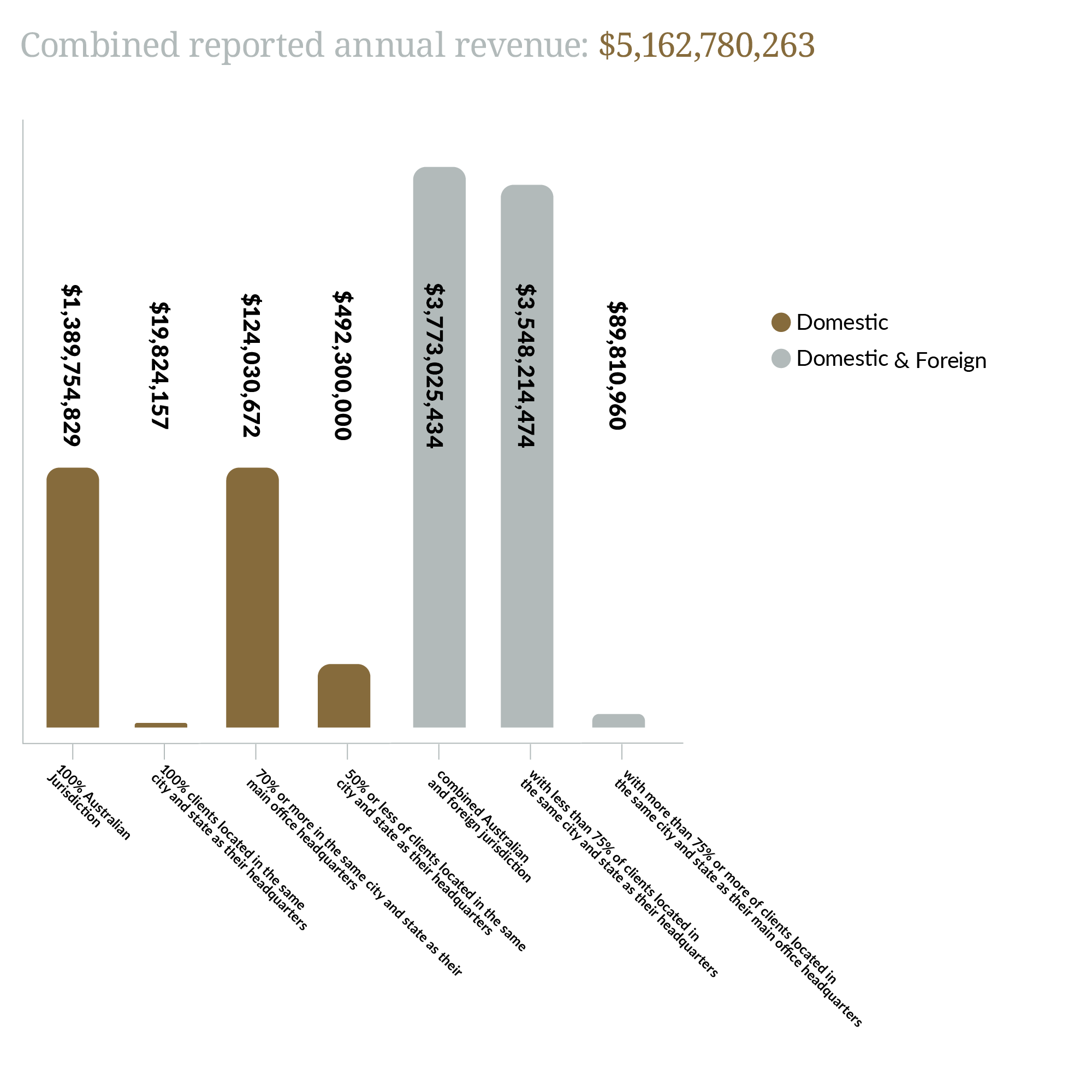 Firms focusing solely on the Australian market reported a combined revenue of $1,389,754,829. In contrast, the 19 firms that reported serving both Australian and foreign markets generated a total revenue of $3,773,025,434, highlighting the financial significance of international casework.