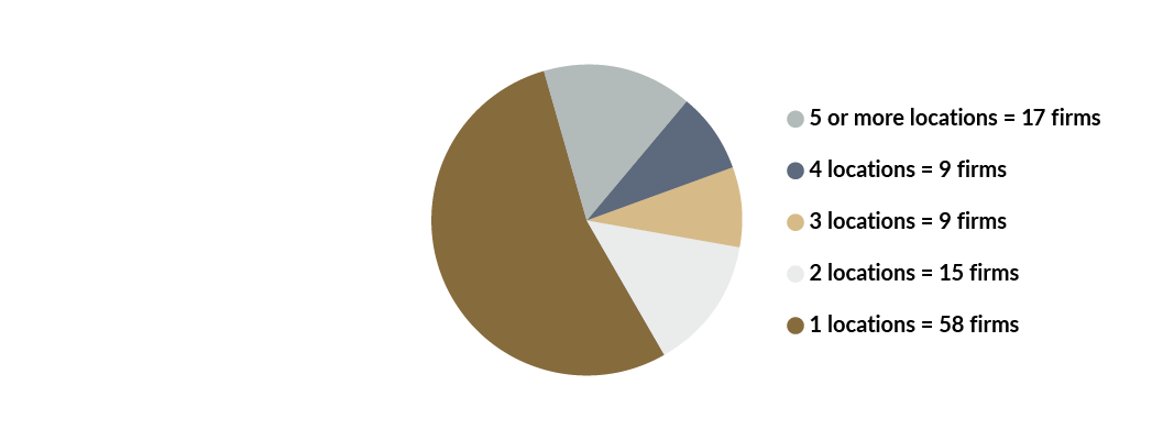 The survey data reveals an interesting distribution of firm locations across Australia. While most responding firms (58) operate from a single central office, there is a notable presence of firms with multiple offices nationwide. Seventeen firms boast a widespread national presence with five or more locations, while others maintain a strategic presence in key cities with two to four offices.